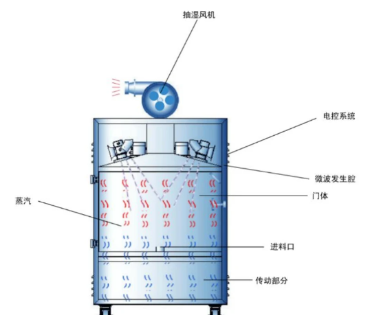 微波是频率从 300MHz~300GMHz 的电磁波,其方向和大小随时间作周期性变化。微波与物料直接作用,将超高频电磁波转化为热能的过程即为微波加热过程。水是强烈吸收微波的物质,物料中的水分子是极性分子,在微波作用下,其极性取向随着外电磁场的变化而变化,2450MHz的微波可使水分子每秒运动24.5亿次,致使分子急剧磨擦、碰撞,使物料产生热化和膨化等一系列过程从而达到微波加热目的。
