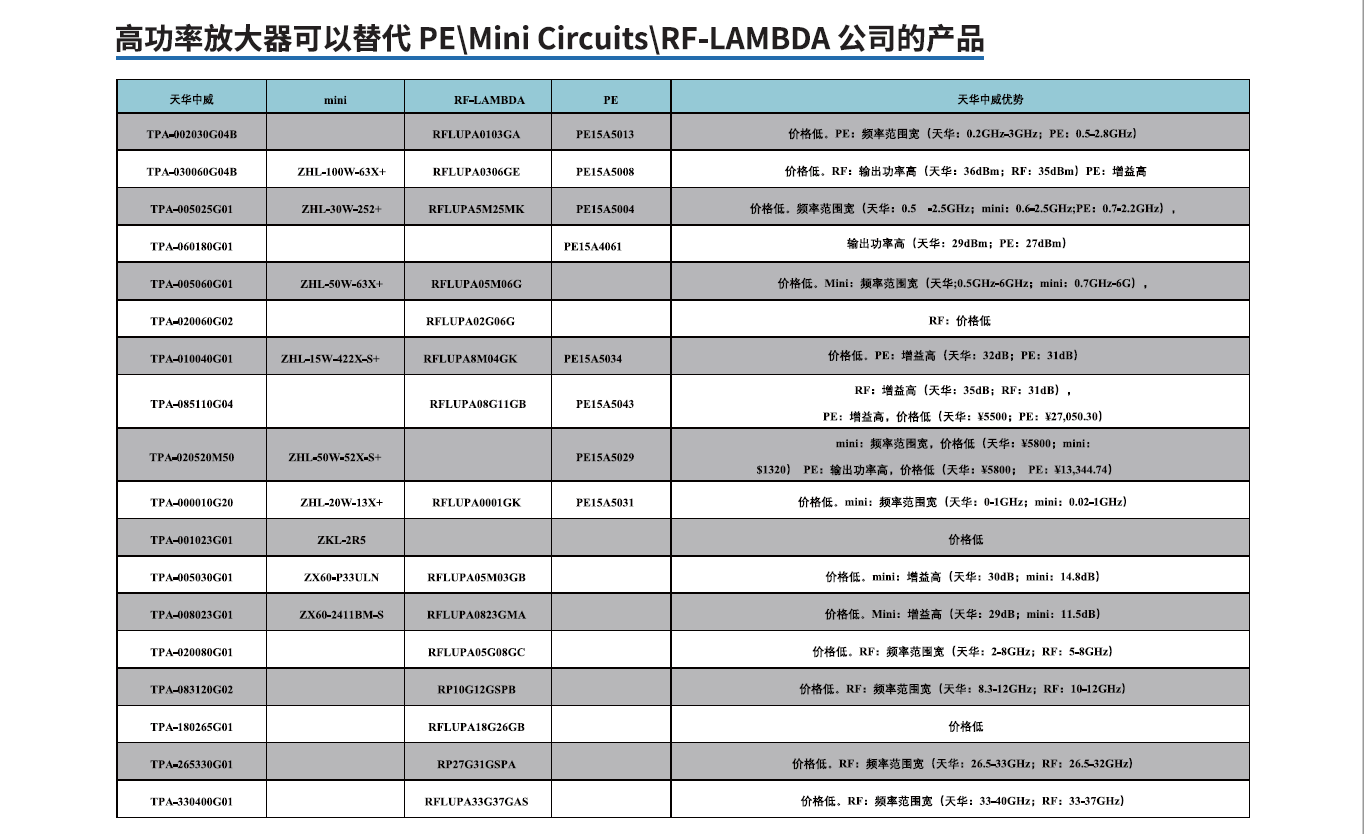 | TPA-005025G01 | ZHL-30W-252+ | RFLUPA5M25MK | PE15A5004 | 价格低,频率范围宽(天华:0.5-2.5GHz;mini:0.6-2.5GHz;PE:0.7-2.2GHz) |